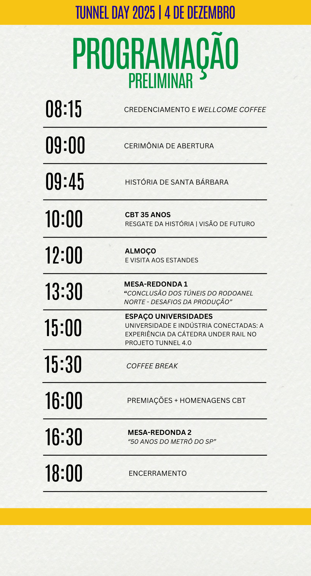 Com o objetivo principal de reunir a comunidade tuneleira e de estruturas subterrâneas para discutir os avanços do setor, o evento também comemora o dia de Santa Bárbara (4 de dezembro), a protetora dos tuneleiros e mineradores.