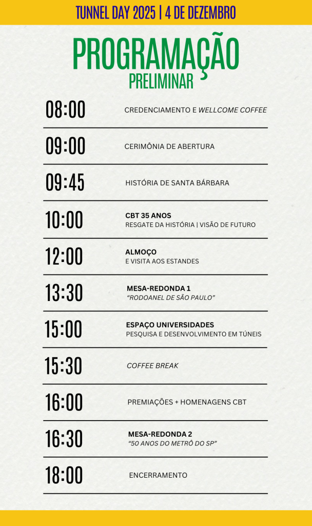 O Comitê Brasileiro de Túneis e Espaços Subterrâneos (CBT) realizará, em 4 de dezembro, o Tunnel Day 2025, encontro que marcará não apenas mais uma edição do tradicional evento do setor, mas também a comemoração dos 35 anos de atuação do Comitê.